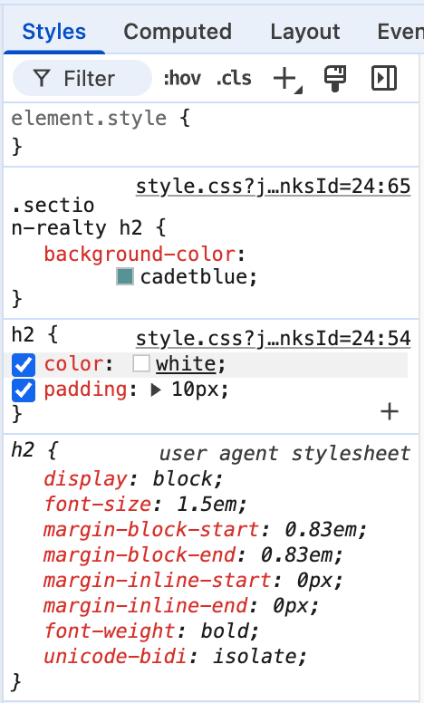 Использование стилей для тэга h2 внутри section-realty: