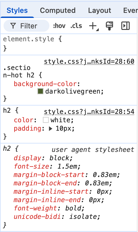 В коде выше, мы имеем общий для всех тэгов h2 стиль. Переопределить его, можно раскоменнтировав
