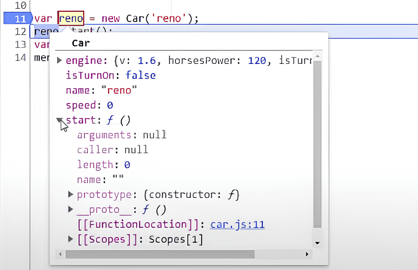 1)🔍 JavaScript ищет метод start в объекте reno.