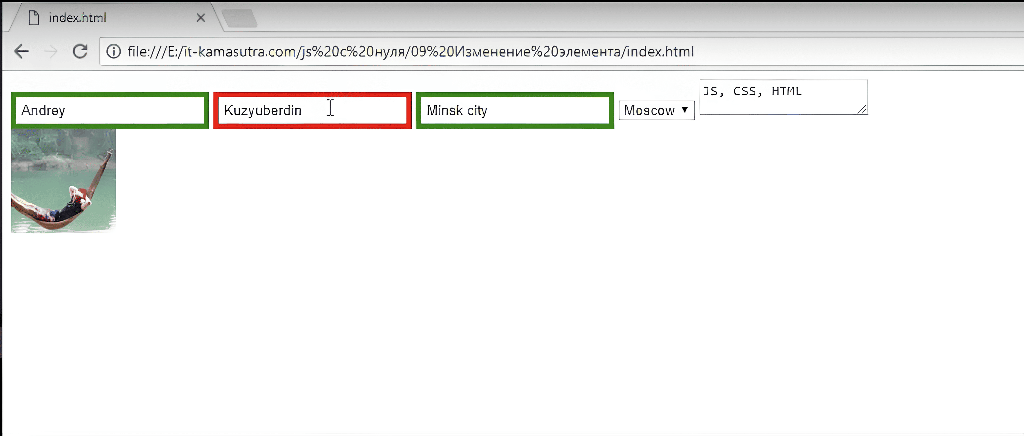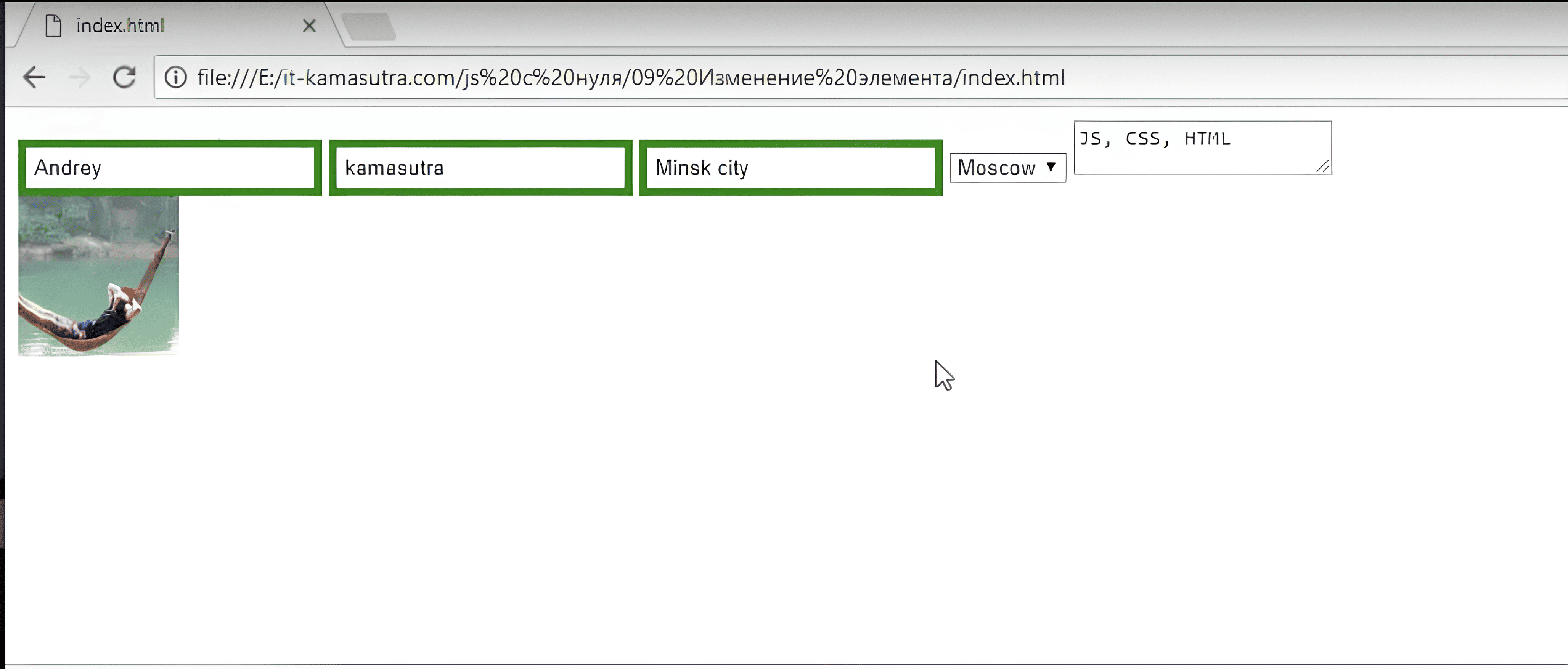 видим в браузере имя Andrey. Почему? Потому что JS нашёл этот элемент и изменил его значение