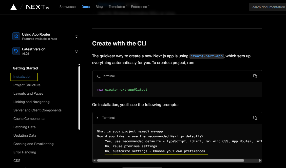- Найти команду установки: зайдите в документацию Next.js, откройте Get started, затем Installation. Команда находится в разделе Create with the CLI.