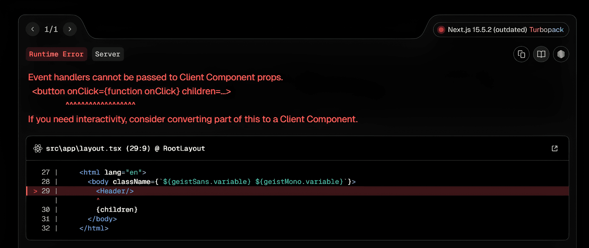 Проблема возникает, когда разработчик пытается разместить компонент с обработчиками событий (например, клики) напрямую внутри серверного компонента.
