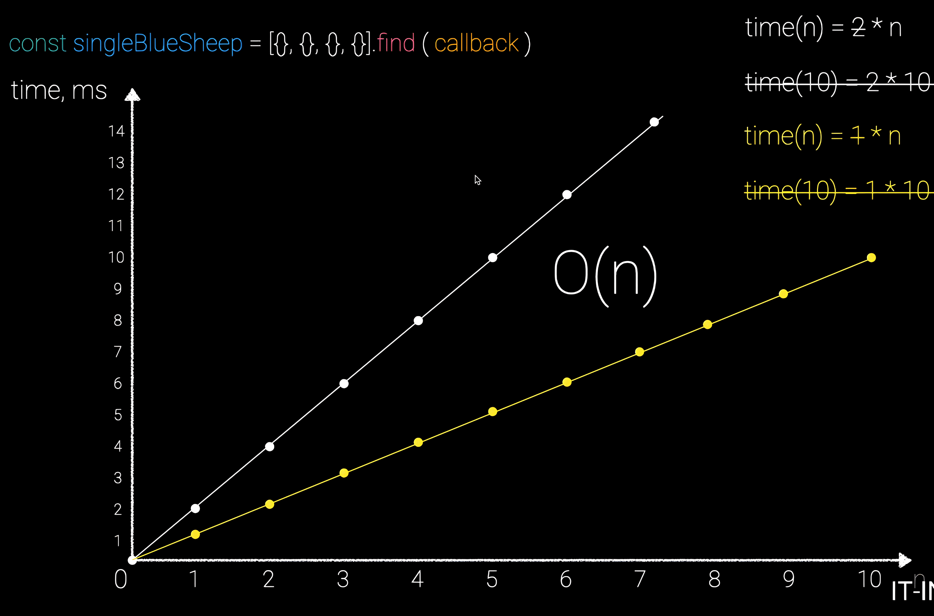 График наглядно демонстрирует, почему сложность O(n) называется линейной — время выполнения