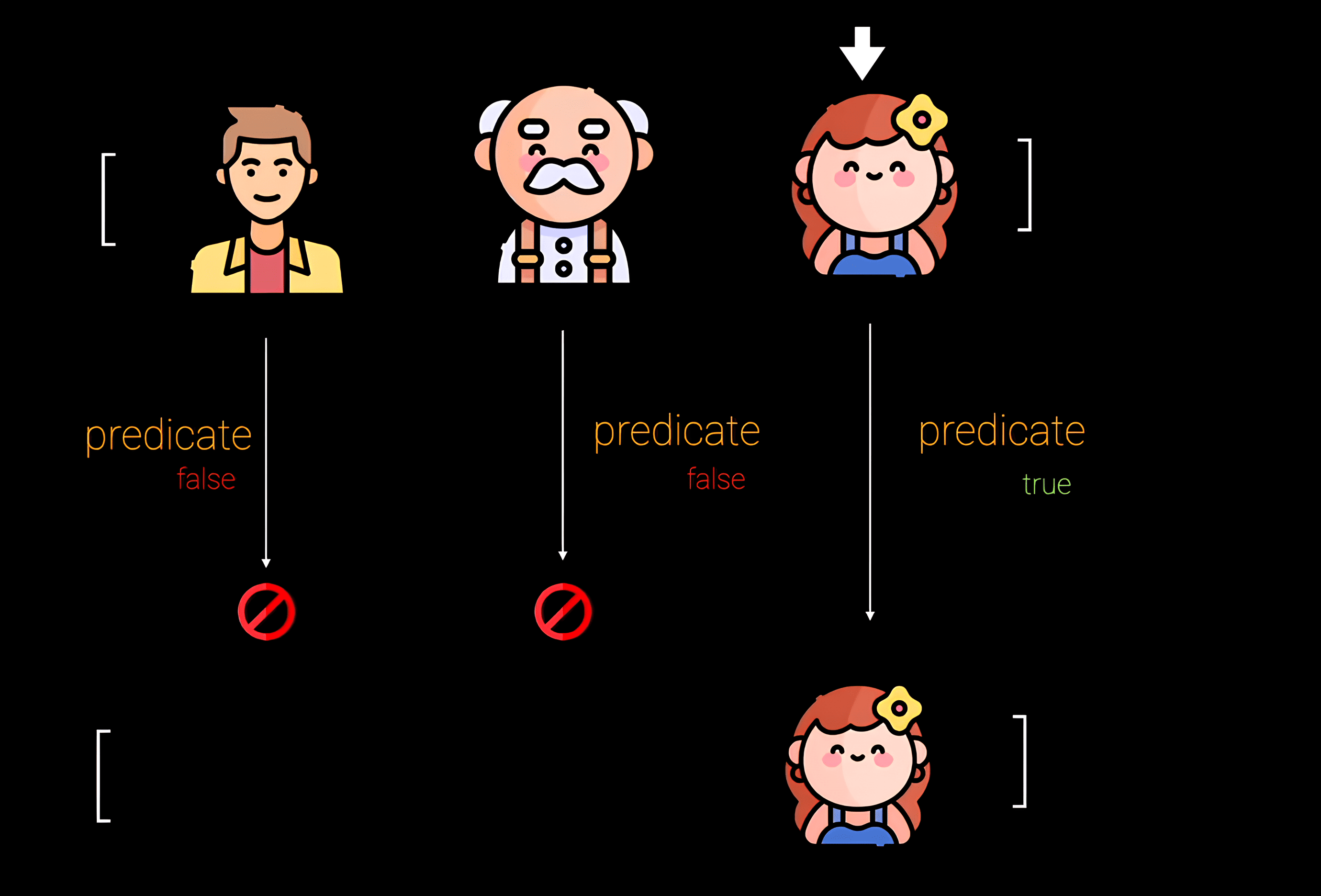 filterотфильтровал овечек, мы передаем внутрь него функцию-callback(предикат). Callbackработает с каждой овечкой и возвращаетtrue, если овечка подходит под условие (например,она желтого цвета), иfalse— если нет.- После того как каждая овечка проверена,