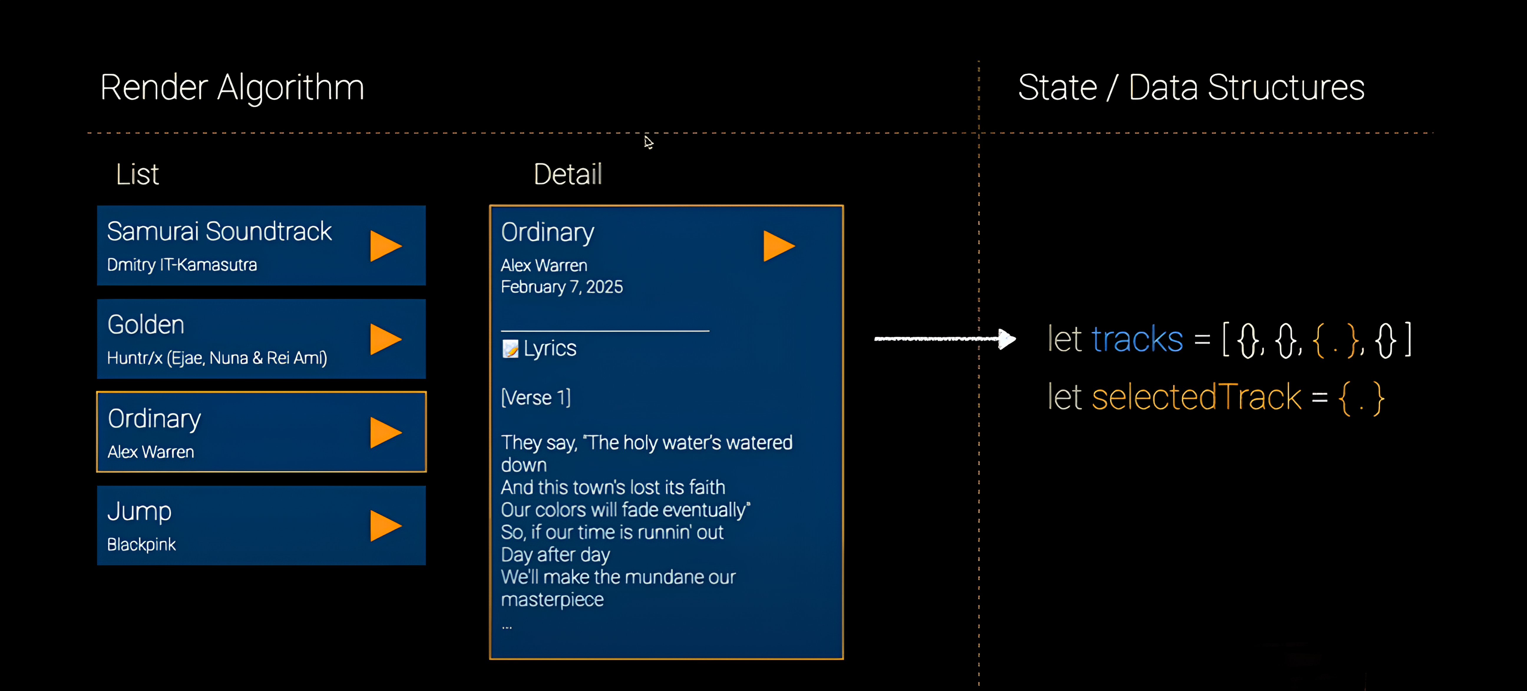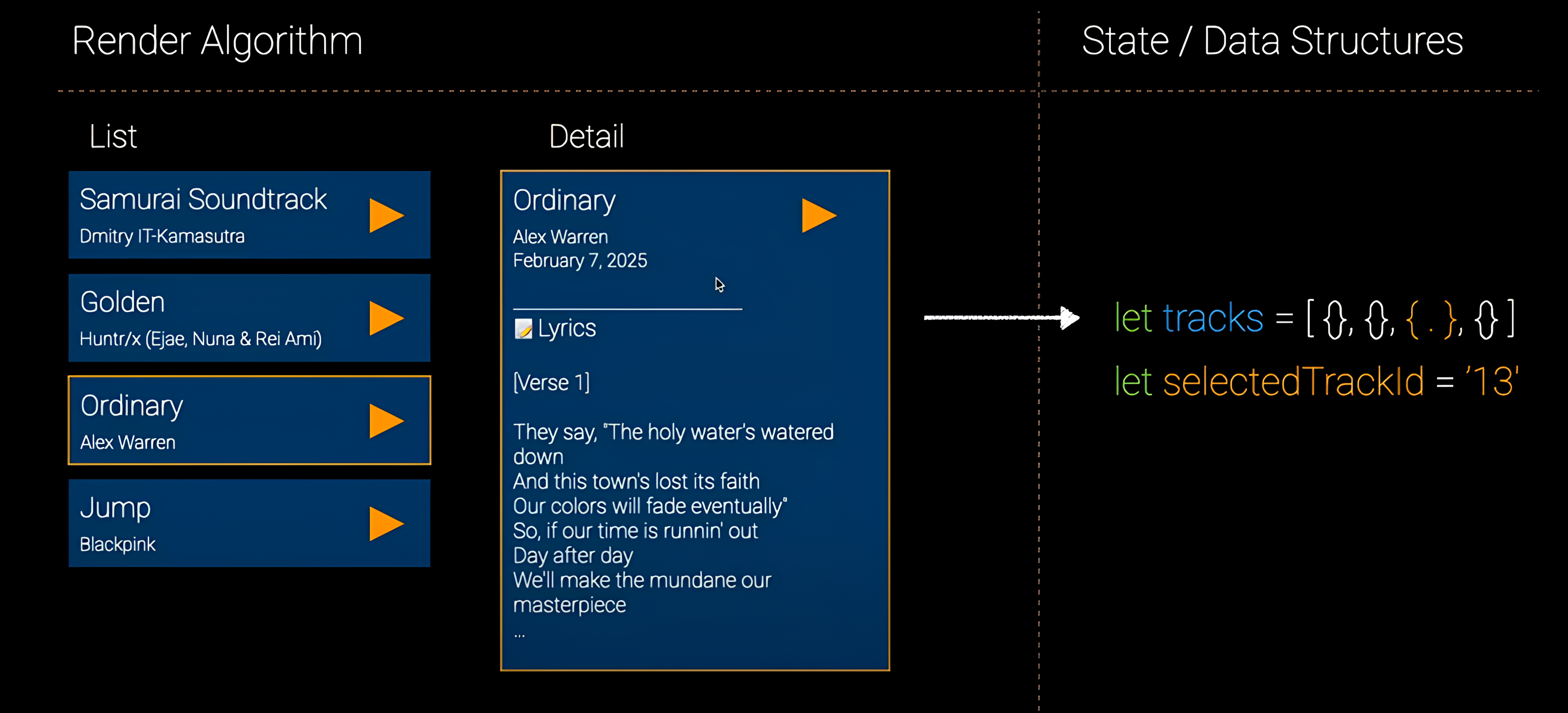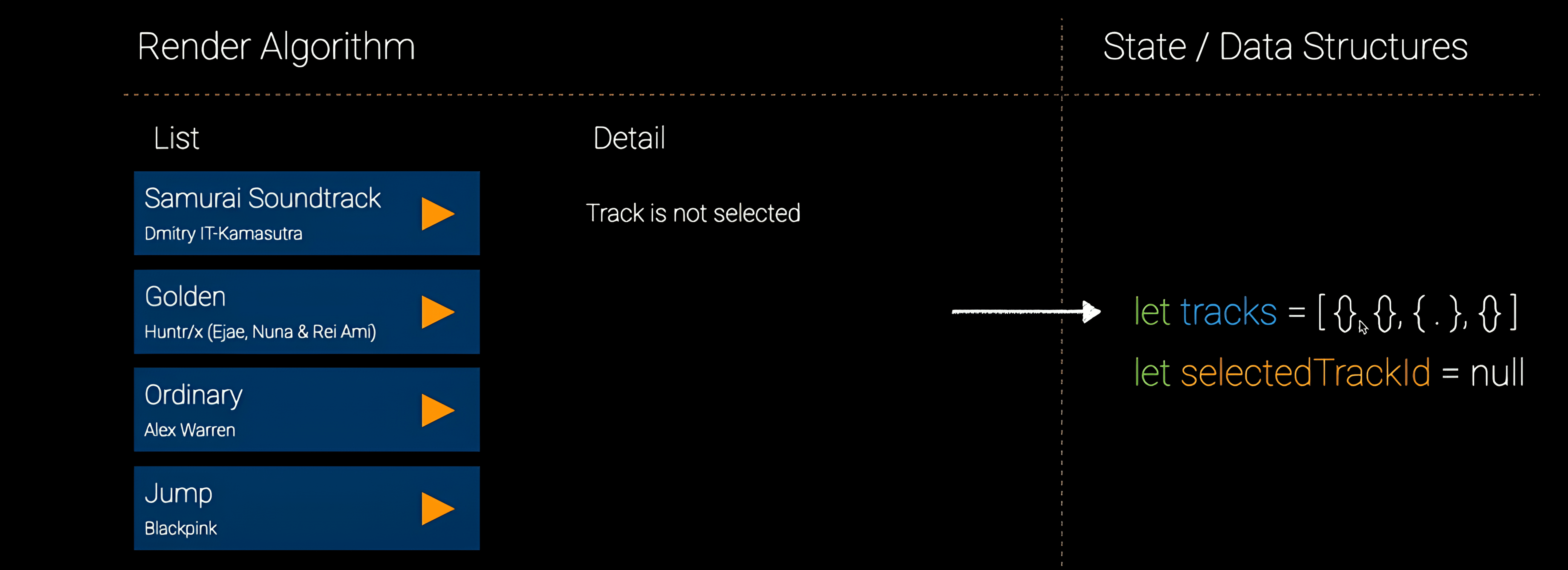 tracks(массив объектов) - Хранит список всех треков для отображения.selectedTrackId(идентификатор выбранного трека, который может быть null или фактическимID) - ХранитIDвыбранного трека. Еслиnull, ни один трек не выбран.