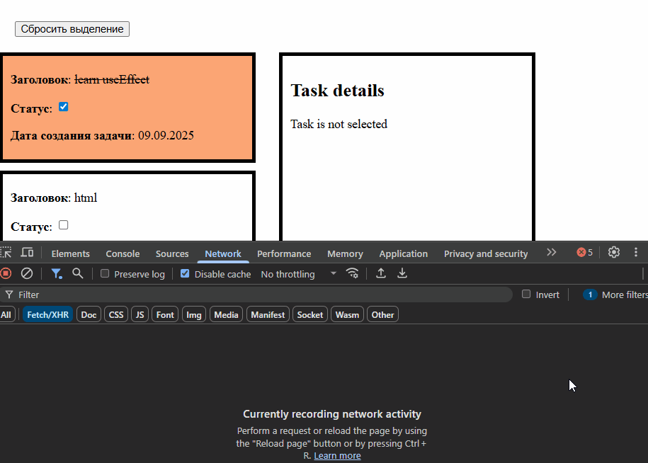 Итоговый результат 🚀. При клике на таску идёт запрос на сервер, приходит детальная информация и выводится в блоке деталей