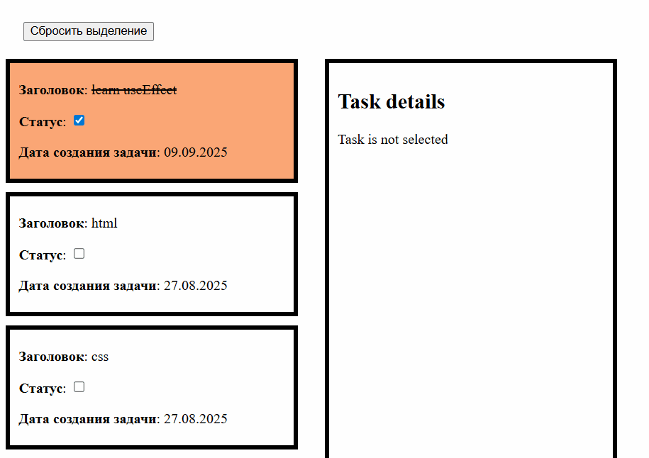 - При выборе задачи справа должен появляться блок с деталями. В блоке с деталями выведи заголовок