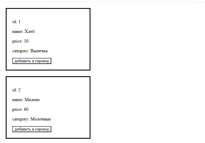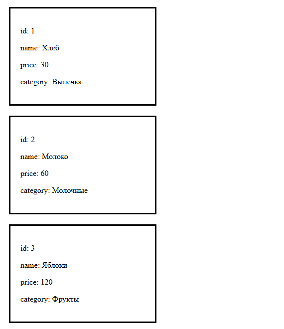 product(object) с полями:id,name,price,category- Отображать название, цену и категорию