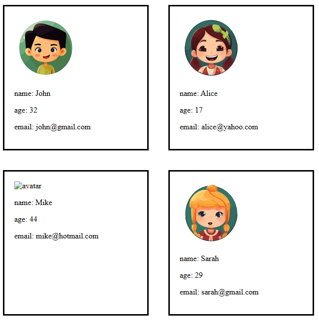 id(number) - идентификатор пользователяname(string) - имя пользователяage(number) - возрастemail(string) - электронная почтаavatar(string) - URL аватарки
