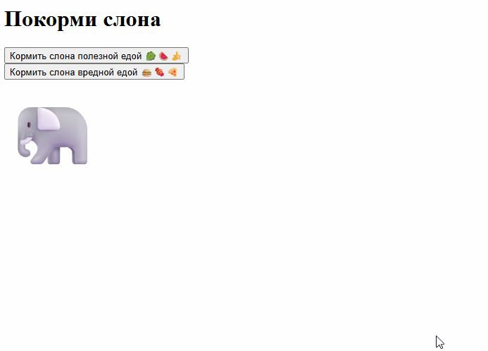 - При нажатии на вторую кнопку вес слона должен уменьшаться на 20, т.к. ребенок будет кормить слона вредной едой