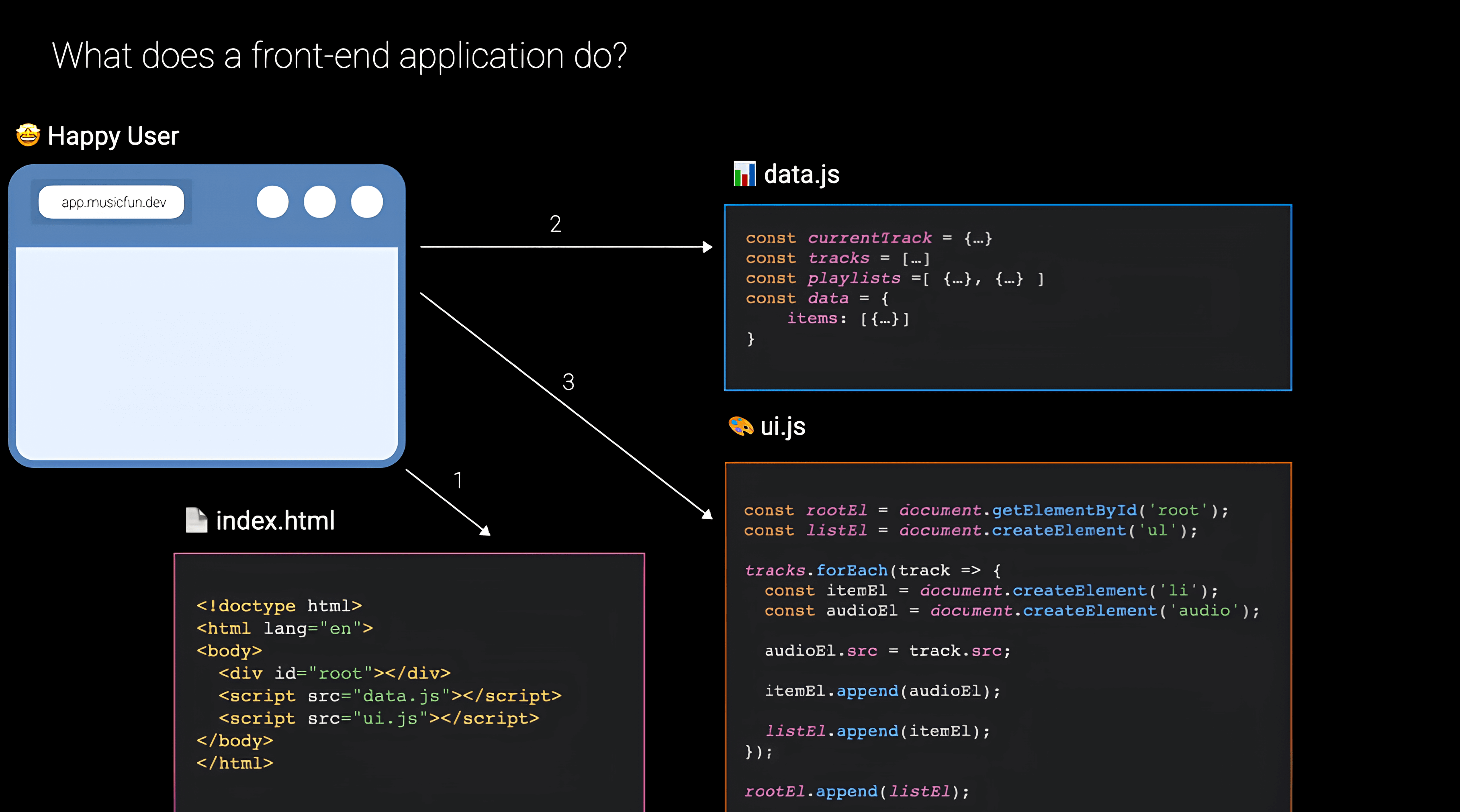 DOM-элементы(заголовки, списки, плееры); - вставляет их на страницу.