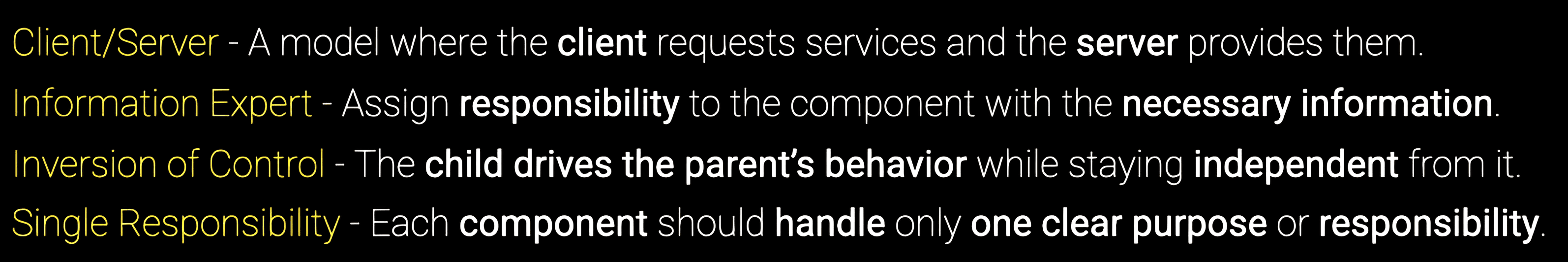 Компонент или модуль должен отвечать только за одну задачу. Если необходимо изменить внешний вид, не должны затрагиваться логика данных или структура запросов. Мы, как программисты, хотим расширять систему, но не модифицировать уже написанный код.