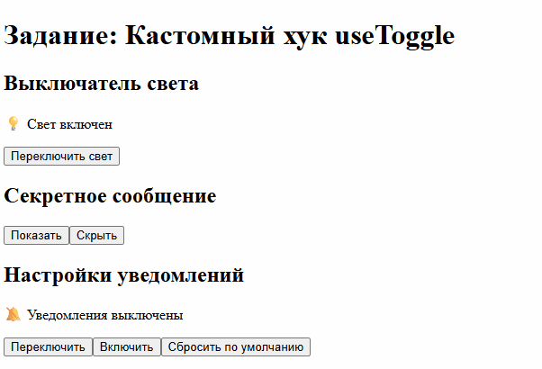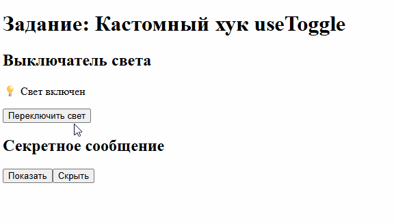 useToggleс начальным значениемfalse - Показывать/скрывать секретное сообщение "🎉 Это секретное сообщение!"