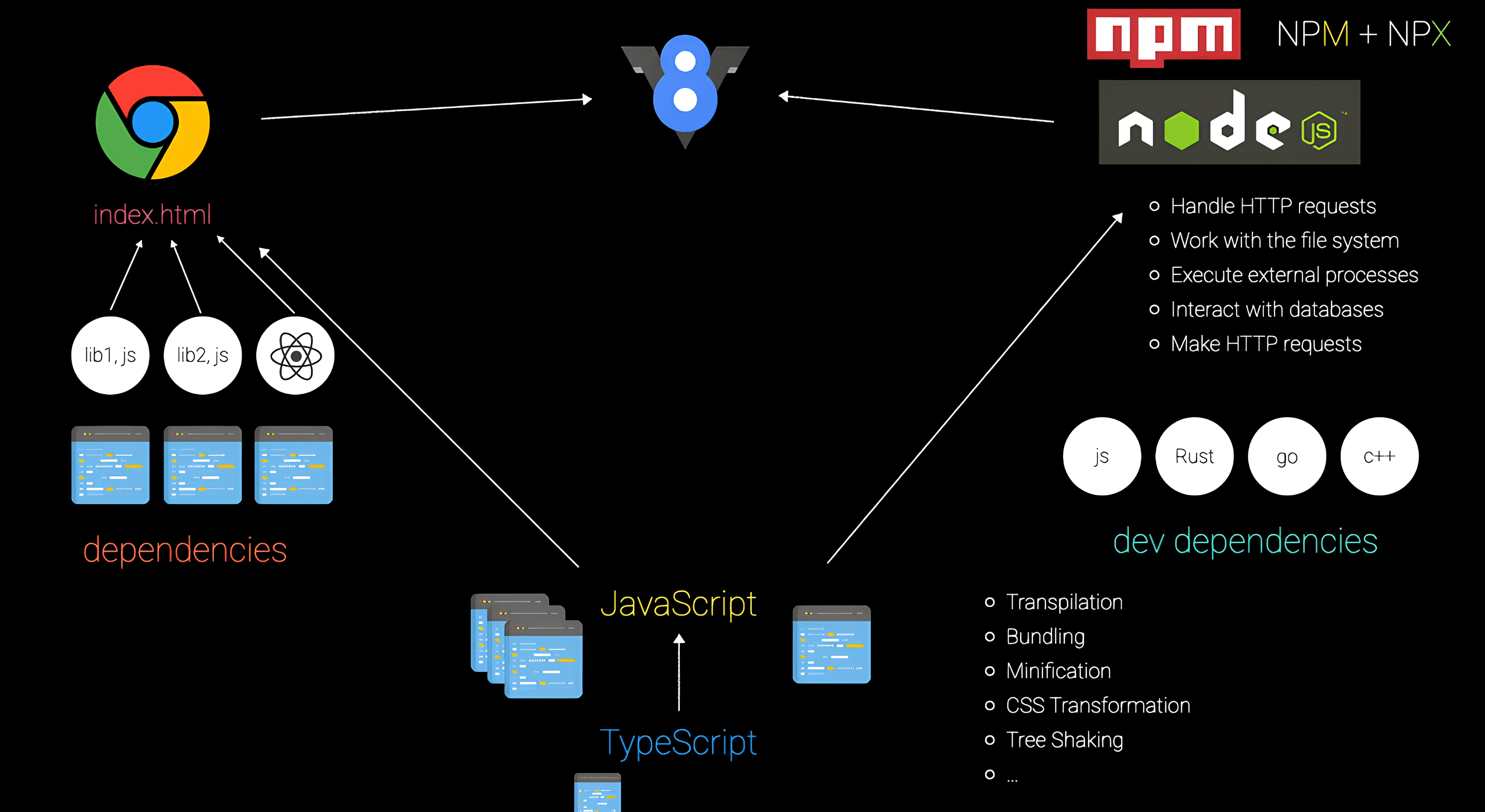 - Node.js позволяет автоматизировать весь процесс: управлять зависимостями для разработки (devDependencies), запускать сборщики, транспиляторы и тесты.