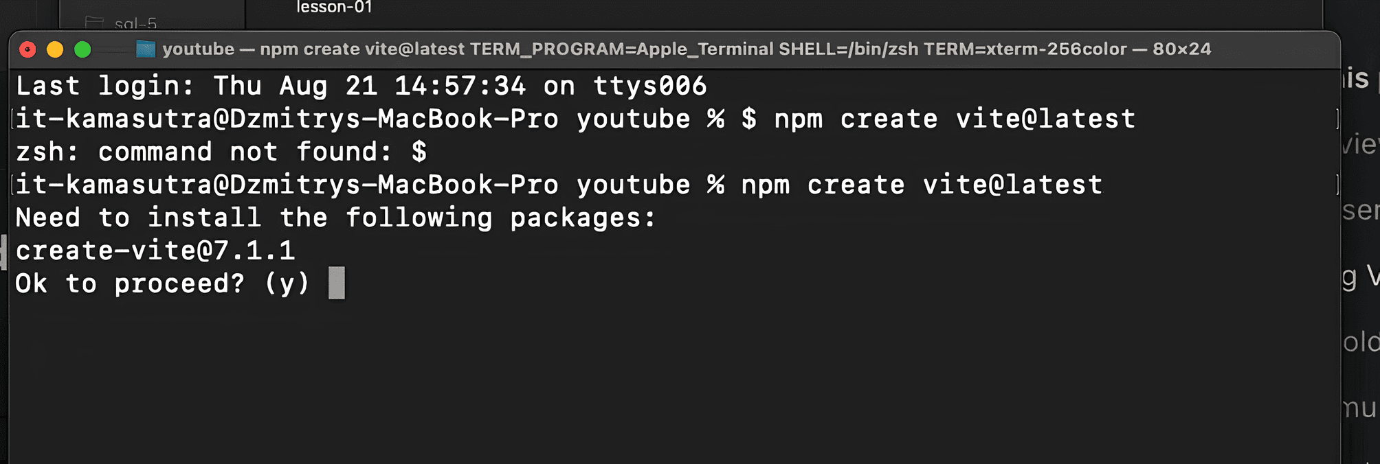 Здесь вводим y, подтверждаем, что мы хотим установить Vite.