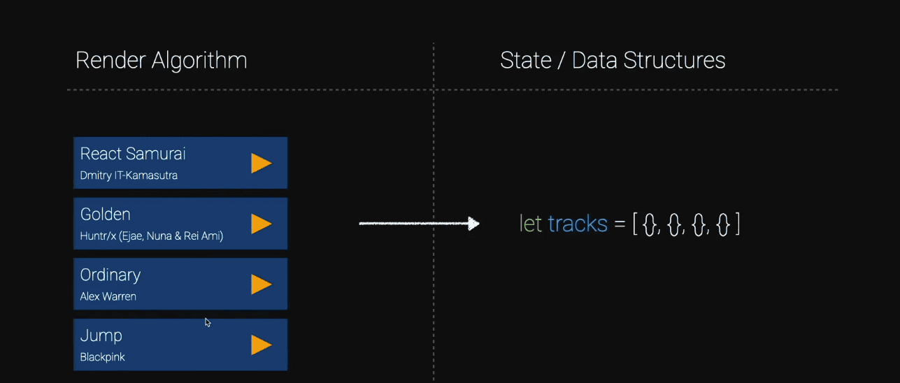 Мы сейчас на нативном JS создадим наше фронтенд-приложение. Первое, что мы с вами должны запомнить на всю жизнь: у нас есть данные и есть алгоритм рендера этих данных. Данные первичны. От данных потом появляется разметка. Поэтому создадим объект с данными:
