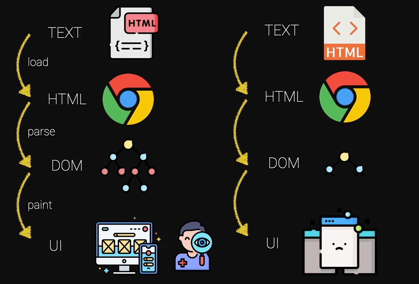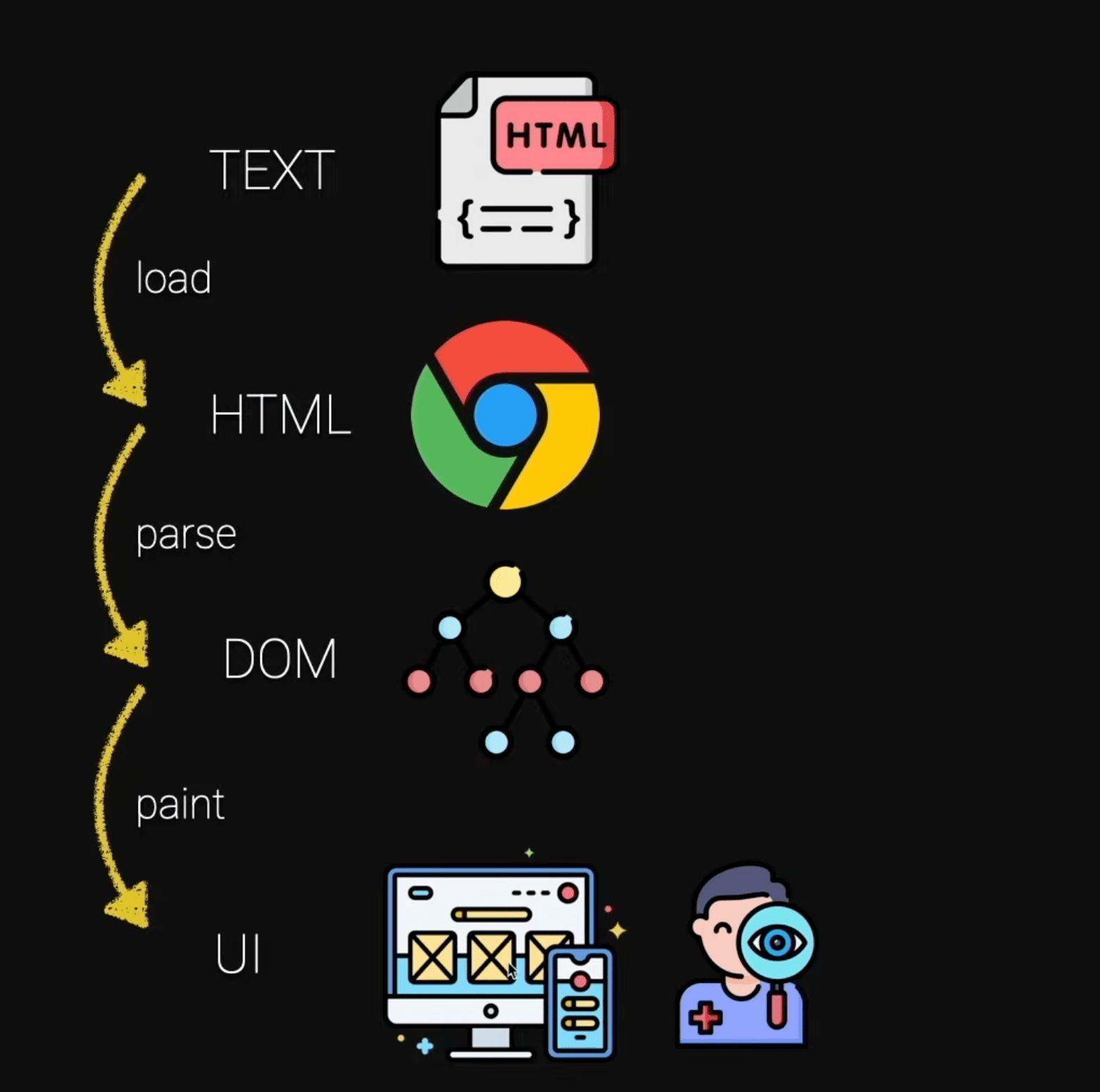 - Дальше браузер имея DOM на основании его может отрисовать UI - визуальную часть которую мы можем видеть.