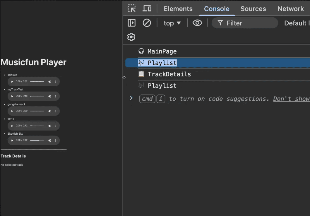 Мы могли бы продолжить разработку плеера на чистом JavaScript: добавить обработчики событий, реализовать загрузку, создание и удаление треков, вручную управлять состоянием и выполнять запросы. Однако такой подход быстро усложняет код и делает разработку менее комфортной и более затратной по времени, так как большая часть усилий уходит на работу с DOM и вспомогательную логику. Чтобы упростить процесс разработки и сосредоточиться на более важных аспектах приложения, целесообразно использовать готовые фреймворки и библиотеки, которые решают эти задачи эффективнее и избавляют от необходимости реализовывать базовую инфраструктуру вручную.