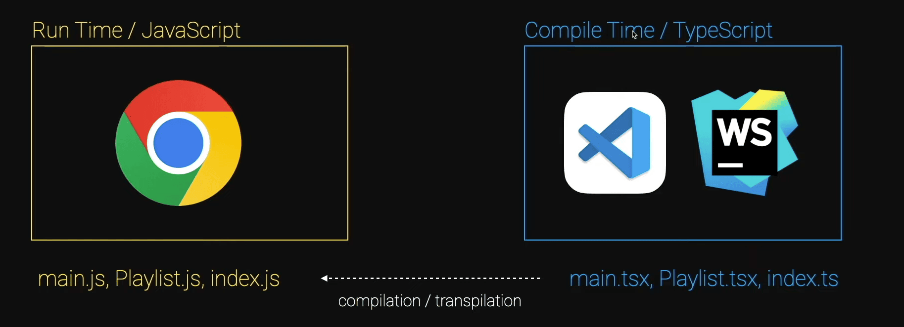 На этапе выполнения (Run Time) браузер получает уже готовые JavaScript-файлы (main.js, Playlist.js, index.js) и выполняет их. Браузер не знает о TypeScript и типах — вся эта логика существует исключительно на этапе разработки и служит инструментом повышения качества и удобства разработки.